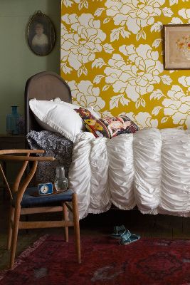 I love this wallpaper from Anthro. I REALLY love the idea of using wallpaper to make a small space more interesting. It's also really trendy right now to put it behind your bed from the wains coating up to create the look of a headboard or behind book shelves for a splash of color.